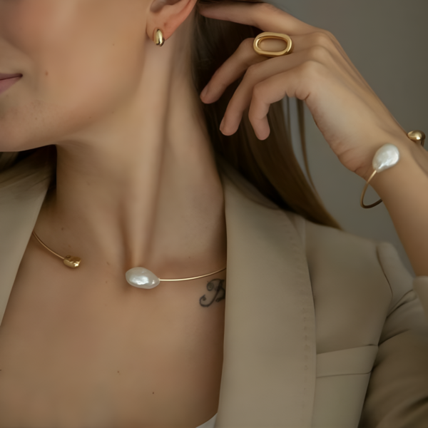 Sublimez votre tenue avec cet élégant ensemble en or, composé d’un bracelet et d’un collier style jonc, chacun orné d’une perle délicate. Alliant design épuré et détails sophistiqués, cet ensemble est parfait pour rehausser vos tenues du quotidien ou accompagner vos looks de soirée.