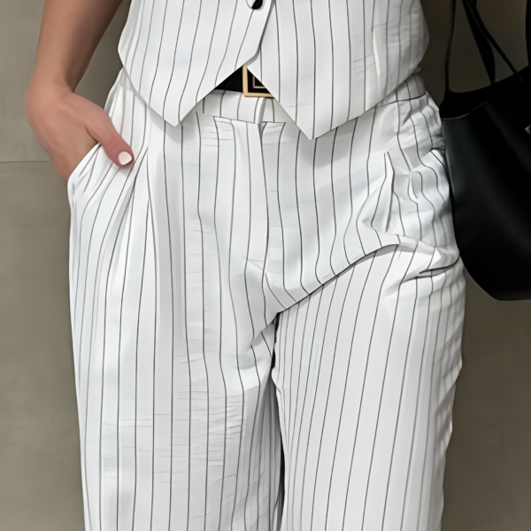 Complétez votre tenue avec ce pantalon d’ensemble rayé, conçu pour un style chic et raffiné. Avec sa coupe ajustée et son motif rayé élégant, il allonge la silhouette tout en offrant un confort optimal. Portez-le avec la veste assortie pour un look harmonieux ou combinez-le à un haut uni pour un style décontracté.